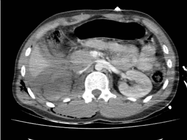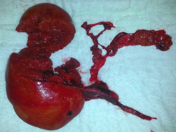 [P-102]Oturum adı: POSTER SESSION 2 | Oturum salonu: POSTER AREA | Oturum tarihi: 17 Ekim 2014 | Oturum saati: 08:00 - 13:00İzole grade 5 böbrek yaralanması: Olgu sunumuHüseyin Aydemir1, Fikret Halis1, Osman Köse1, Şükrü Kumsar1, Adil Emrah Sonbahar1, Hacı İbrahim Çimen1, Hacı Can Direk1, Orhan Yağmurkaya2, Hasan Salih Sağlam1, Ahmet Gökçe1, Öztuğ Adsan12Sakarya Üniversitesi, Tıp Fakültesi Eğitim ve Araştırma Hastanesi, Genel Cerrahi Ana Bilim Dalı, Sakarya AMAÇ: Bu çalışmada araç içi trafik kazası(AİTK) nedeniyle oluşan izole grade 5 renal travmalı olguyu sunmayı amaçladık. YÖNTEM: Yirmi iki yaşında erkek hasta AİTK nedeniyle acil servise getirildi. Hastanın ilk değerlendirmesinde genel durumunun kötü, şurunun kapalı olduğu gözlendi TA:40/50 mm/Hg Nabız:109/dk. idi. Laboratuarında Hb/Htc: 11/36 olup yapılan kontrastlı tüm vücut tomografisinde sağ böbreğin kontrast tutmaması dışında özellik yoktu. Böbrek konturları normal olarak gözlendi (Resim 1). Vital bulguları stabil olmayan hasta bu bulgular ile acil şartlarda operasyona alındı. BULGULAR: Batın orta hat insizyon ile katlar geçildi. Batın içinden yoğun hematom boşaltıldı. Barsaklarda herhangi bir yaralanma gözlenmedi. Karaciğer (KC)ve dalak sağlamdı. Sol böbrek konturları normal olarak gözlendi. Sağ tarafta KC’in arkasında retroperitonun açık olduğu ve böbreğin parçalı olarak pedikülünün komplet koptuğu görüldü (Resim 2). Retroperiton bu alanda tamamen açıldı, renal ven ve arterin proksimal kısımları bulunarak ayrı ayrı bağlandı. Cerrahi sahaya dren konularak işlem sonlandırıldı. Hasta postoperatif dönemde ilk üç gün yoğun bakım ünitesinde takip edildi. Hastaya altı ünite kan transfüzyonu yapıldı. Takiplerinde problem olmayan hasta postoperatif 6. gün taburcu edildi. SONUÇ: Grade 5 böbrek travması nadir dahi olsa gözlenmektedir. Literatürde konservatif yaklaşım ile iyi sonuçlar alınmış olgular bildirilmektedir. Ancak bizim olgumuzda olduğu gibi komplet pedikül kopması olabileceği göz ardı edilmemelidir. Grade 5 ısollated kidney ınjury: a case reportHüseyin Aydemir1, Fikret Halis1, Osman Köse1, Şükrü Kumsar1, Adil Emrah Sonbahar1, Hacı İbrahim Çimen1, Hacı Can Direk1, Orhan Yağmurkaya2, Hasan Salih Sağlam1, Ahmet Gökçe1, Öztuğ Adsan12Ministry of Health Sakarya University Education and Research Hospital,Department of General Surgery, Sakarya,Turkey OBJECTIVE: In this study, we aimed to present a patient with grade 5 isolated renal injury caused by in-car traffic accident (ICTA). METHOD: Twenty-two year old male patient was brought to the emergency department because of ICTA. In the initial assessment: the patient's general condition was bad, and unconsciousness. Blood pressure (BP) was 40/50 mm/Hg and heart rate (HR) was 109/min. Laboratory Hb / Hct: 11/36 and the whole-body CT scan with contrast was unremarkable except right kidney was not contrast enhancement. Normal renal contour was observed (Figure 1). The patient was operated under emergency condition with unstabil vital signs and this findings. RESULTS: It was passed floors with midline abdominal incision. Intense intraperitoneal hematoma was evacuated.There were no injuries in the intestines. The liver and spleen were intact. The left kidney contour was observed as normal. It was observed that retroperiton is open on the right side, behind the liver and pedicle of the kidney was completely ruptured (Figure 2). Retroperitoneum was fully opened in this area, the proximal portions of the renal vein and artery were found and connected separately. Drain was placed in the surgical site, and the process was terminated. The patient were followed up in the intensive care unit in the first three days of the postoperative period. The patient was transfused with six units of blood. There is no problem during follow-up and the patient was discharged on postoperative day 6. SONUÇ: Grade 5 isolated renal injury can be observed even rare. In the literature, patients were managed conservatively with good results are reported. However, complete pedicle rupture may be as in our case and this phenomenon should not be ignored. |