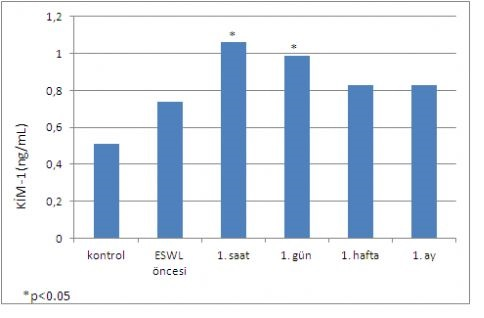 [SS-147]Oturum adı: ORAL SESSION 8 | Oturum salonu: SALON 5 | Oturum tarihi: 17 Ekim 2014 | Oturum saati: 14:30 - 17:00KIM-1(Kidney Injury Molecule-1) böbrek taşı tedavisinde tekrarlayan ESWL seans süreleri için noninvaziv bir marker mıdır?Hasan Rıza Aydın1, Lokman İrkılata1, Mustafa Aydın1, Mansur Dağgülli2, Mehmet Hakan Taşkın3, Hüseyin Cihan Demirel1, Şenol Adanur4, Caner Moral1, Mustafa Kemal Atilla1, Ahmet Ali Sancaktutar22Dicle Üniversitesi, Üroloji Ana Bilim Dalı, Diyarbakır 3Samsun Eğitim ve Araştırma Hastanesi, Tıbbi Mikrobiyoloji Bölümü, Samsun 4Atatürk Üniversitesi, Üroloji Ana Bilim Dalı, Erzurum Amaç; ESWL, renal papilla ve kortekste iskemi ve oksidatif stres yaparak böbrek hasarına sebebiyet verebilmektedir. KİM-1, iskemik hasar sonrası böbrek proksimal tubül hücrelerinden salınan bir transmembran glikoproteindir. Bu çalışmada ESWL sonrası böbrek hasarının derecesini ölçmeyi ve ESWL seanslarının hangi aralıklarla uygulanması gerektiğini araştırmayı amaçladık. Gereç ve yöntem; Çalışmaya ESWL uygulanan 27’si erkek ve 13’ü kadın olmak üzere 40 hasta ve kontrol grubu olarak da benzer yaş grubunda sağlıklı 40 olgu alındı (Tablo 1). Tüm hastalara aynı ESWL prosedürü uygulandı. Hastaların ESWL öncesi, ESWL sonrası 1. saat, 1. gün, 1. hafta ve 1. ay orta akım idrar örnekleri alındı. KİM-1 seviyeleri ELISA ile ölçüldü. İstatistik olarak t-testi, Mann-Whitney U Testi, Two-Way ANOVA testi yapıldı ve p<0.05 anlamlı kabul edildi. Bulgular; ESWL uygulanan hastaların, tüm alınan KİM-1 değerleri kontrol grubundan yüksek bulundu (p<0.05) (Tablo 2). ESWL uygulanan grupta ise işlemden 1 saat ve 1 gün sonra alınan KİM-1 değerleri, işlem öncesi alınan ve işlemden 1 hafta ve 1 ay sonra alınan değerlere göre anlamlı olarak yüksek bulundu (Grafik 1). Sonuçlar; KİM-1, ESWL’nin sebep olduğu böbrek hasarını erken dönemde ortaya koyabilecek invaziv olmayan bir belirteç olarak kullanılabilir. Ayrıca bu çalışma, böbrek hasarının 1 hafta sonra geri döndüğünü ortaya koyarak, ESWL seanslarının 1 hafta aralıklarla uygulanabileceğini göstermiştir. Is (Kidney Injury Molecule-1) KIM-1 a non-invasive marker to predict the appropriate interval between ESWL sessions in the treatment of kidney stones?Hasan Rıza Aydın1, Lokman İrkılata1, Mustafa Aydın1, Mansur Dağgülli2, Mehmet Hakan Taşkın3, Hüseyin Cihan Demirel1, Şenol Adanur4, Caner Moral1, Mustafa Kemal Atilla1, Ahmet Ali Sancaktutar22Department of Urology, Dicle University, Diyarbakır 3Department of Medical Microbiology, Samsun Training and Research Hospital, Samsun 4Department of Urology, Atatürk University, Erzurum PURPOSE: ESWL may cause kidney injury through ischemia and oxidative stress in renal papillae and cortex. KIM-1 is a transmembrane glycoprotein substance that is released by proximal tubulus cells of kidney following ischemic injury. We aimed to investigate the severity of kidney injury following ESWL and to predict the reasonable intervals between ESWL sessions. MATERIALS-METHOD: A total of 40 patients who underwent ESWL (27 males, 13 females) were included in this study (Table 1). Another otherwise healthy 40 people served as controls. The mid-stream urinalysis were obtained for all patients prior to ESWL and following ESWL at 1st hour, 1st day, 1st week and 1st month. KIM-1 levels were analysed using ELISA. Mann-Whitney U and Two-Way ANOVA tests were used for statistical analysis and a p value <0.05 was considered as statistically significant. RESULTS: KIM-1 levels were higher in all patients in ESWL group than controls (p<0.05) (Table 2). In ESWL group, KIM-1 levels obtained at 1st hour and 1st day were significantly higher than those of 1st week and 1st month (Figure 1). CONCLUSION: KIM-1 can be used as a non-invasive marker for kidney injury in earlier period following ESWL. Besides, we concluded that, kidney injury recovered at 1 week after ESWL, therefore, ESWL could be applied safely at 1 week intervals. ESWL grubunun KIM-1 değerlerinin kendi aralarında karşılaştırılması KIM-1 levels in ESWL group ESWL ve kontrol grubunun demografik verileri